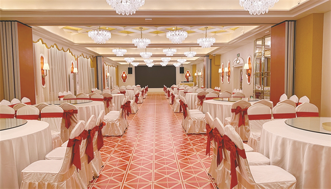 太陽(yáng)廳—面積323㎡,兼做早餐廳,可供 140人同時(shí)用餐;午晚時(shí)段,可改做宴會(huì)廳使用, 能夠承接16桌以下的宴席。