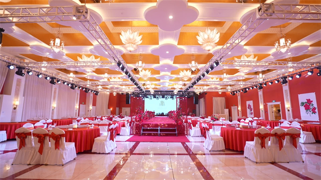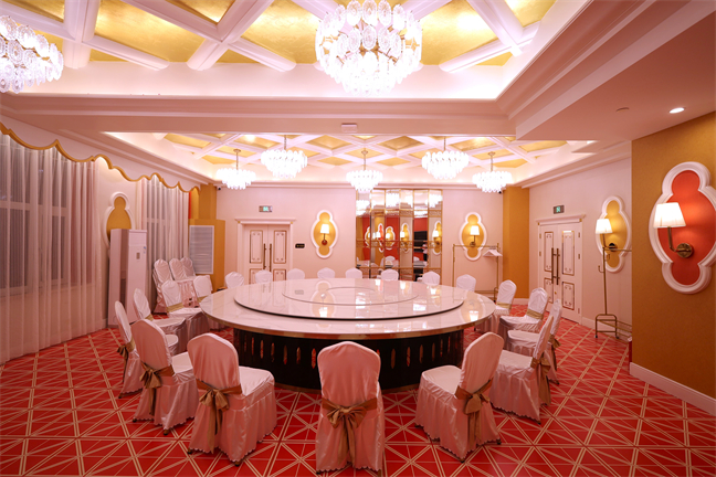 皇宮廳—金碧輝煌、皇宮式裝修,面積1038㎡,層高8.6米,配備愛(ài)情階梯、軌道威亞、二層觀禮臺(tái)、浪漫燈光秀、旋轉(zhuǎn)升降舞臺(tái)、頭頂天幕連接開(kāi)合大屏。可承接50桌的大型宴會(huì),也可舉辦600人的大型會(huì)議;還可用作會(huì)展、車展場(chǎng)地,每逢節(jié)假日還為市民上演文藝節(jié)目。